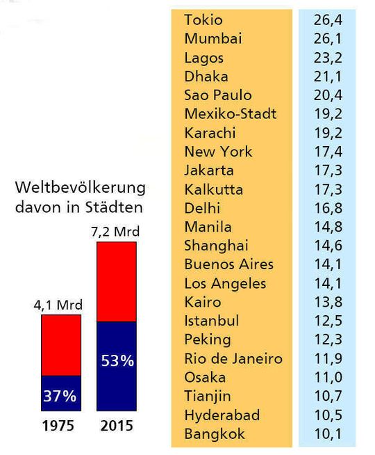 Das alles fördert den Trend zur Urbanisierung. Megacities werden mächtiger als Nationalstaaten“, so Bauer. Während 1970 erst ein Drittel der Menschheit in Städten lebte, werden es 2050 zwei Drittel sein. Schon seit 2007 lebt mehr als die Hälfte der Weltbevölkerung in Städten.